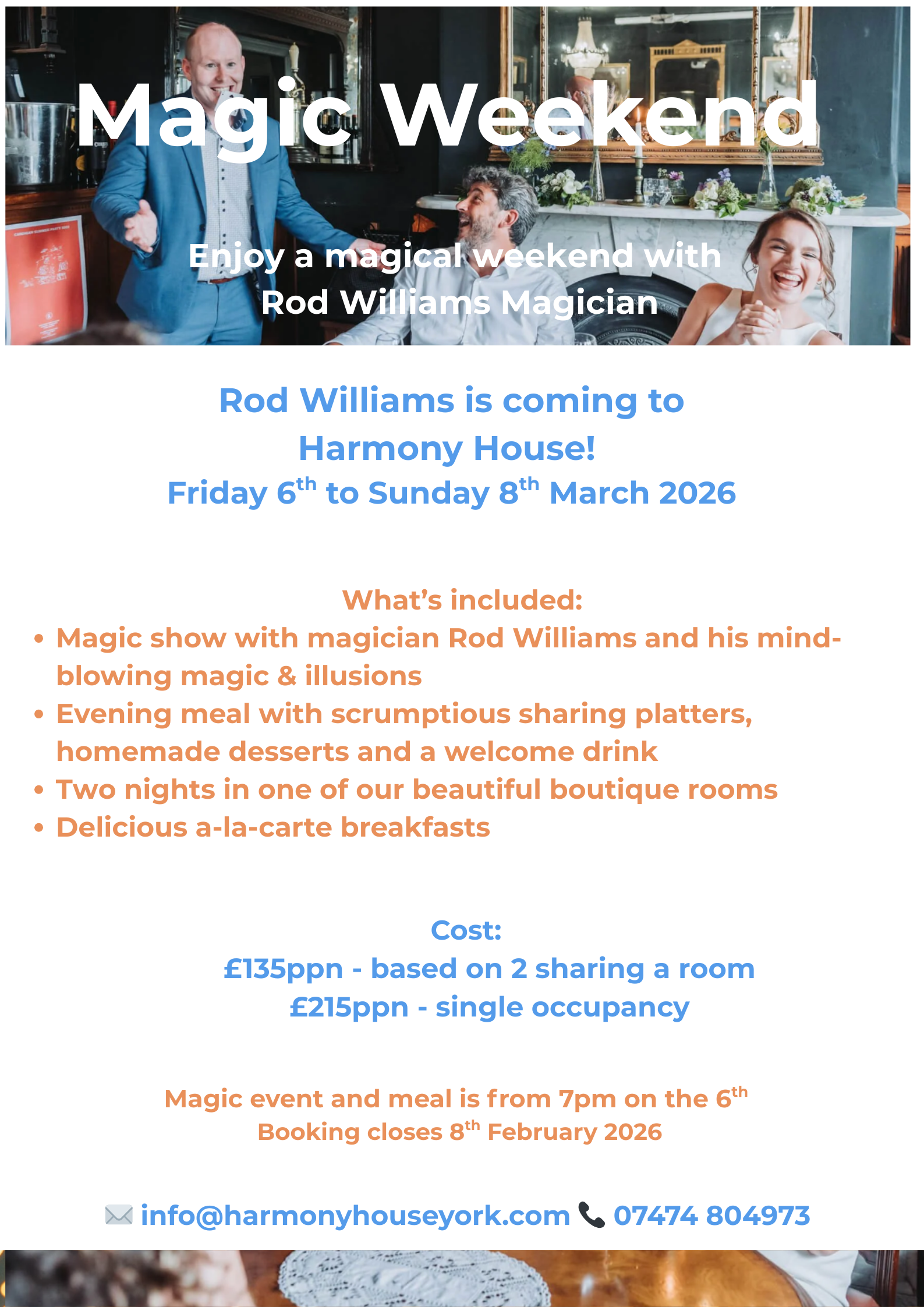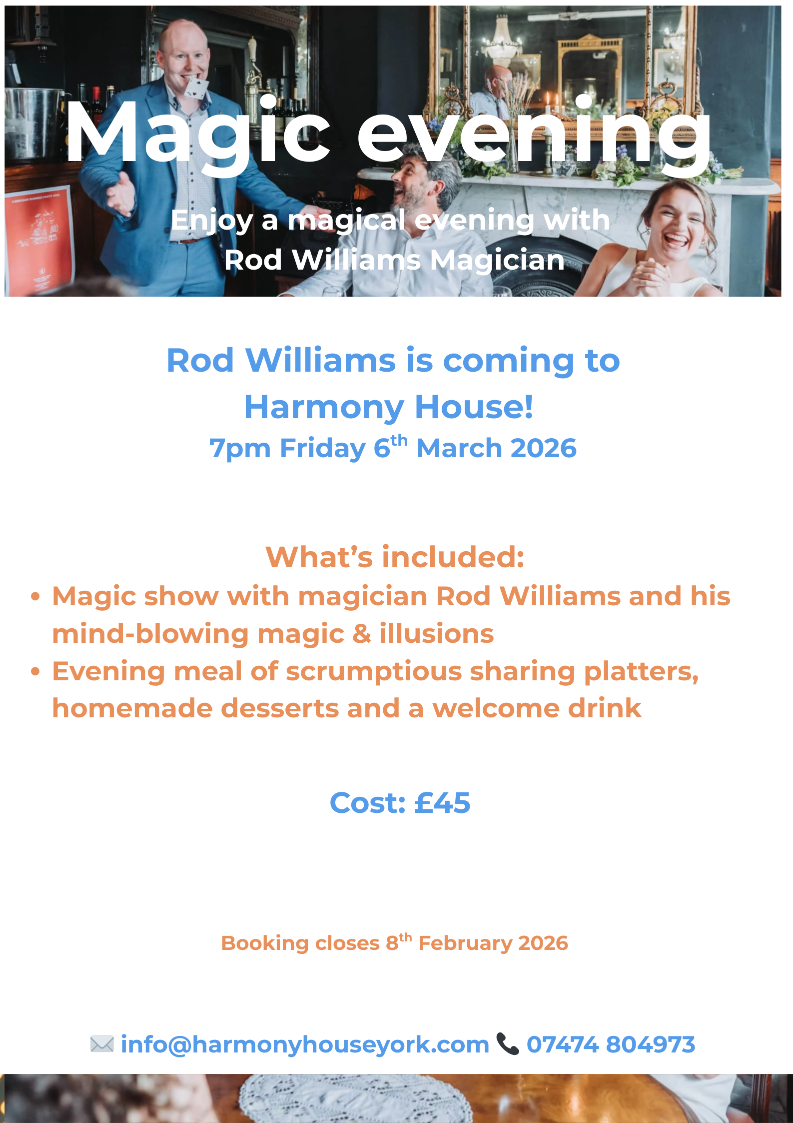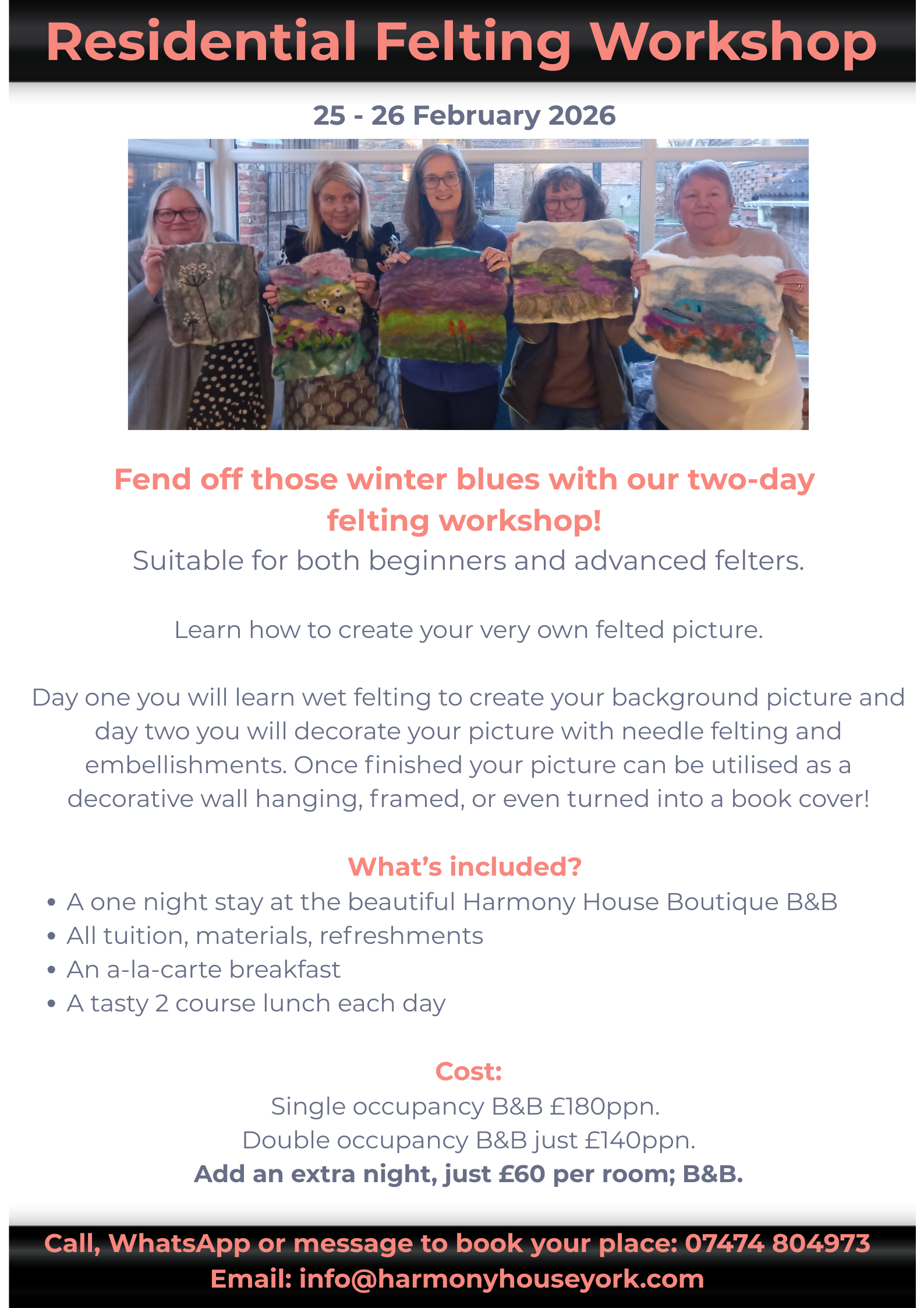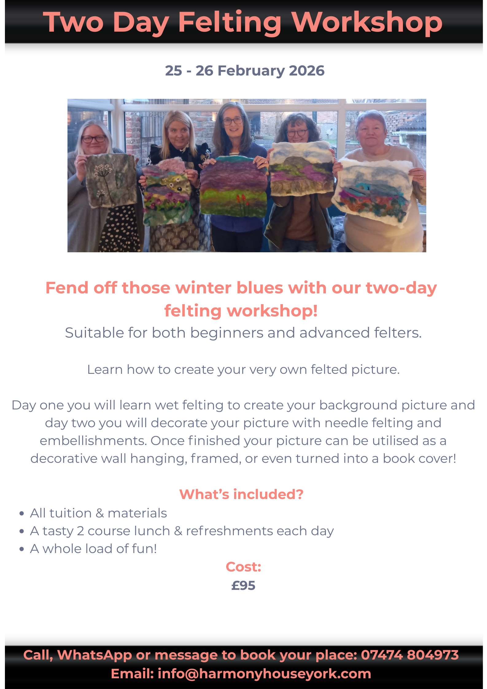 Call or Whatsapp us on 07474 804973 or email info@harmonyhouseyork.com to make a reservation.