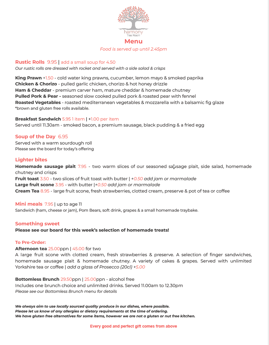 Harmony Tea Room is run by volunteers from the village community.  We have created a gorgeous simple rustic menu, stacked with